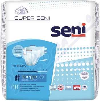 Prodyšné plenkové kalhotky Super Seni jsou určeny pro střední a těžkou inkontinenci. Dvojité savé jádro zajišťuje větší pocit sucha a vnitřní boční záhyby předcházejí úniku moči. Obvod pasu 100-150 cm, savost 2200 ml. Balení obsahuje 10 kusů.