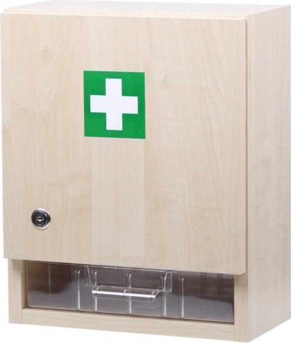 Dřevěná nástěnná lékárnička se zdravotnickým materiálem pro 10 osob. Skříňka lékárničky je vyrobena z kvalitní dřevotřísky. Její vnitřek je pevnou přepážkou rozdělen na 2 stejné části, přičemž jedna z nich je zcela volná a lze do ní umístit další zdravotnický materiál dle uvážení. Skříňka je uzamykatelná, její součástí jsou 2 klíče. Úložný prostor rozšíří i plastová zásuvka ve spodní části skříňky. Součástí balení je i montážní materiál - hmoždinky a šrouby.