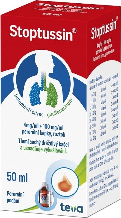 Přípravek se používá k léčbě suchého, dráždivého a obtížně ztišitelného kašle při virových infekcích horních a dolních dýchacích cest, při zánětu hrtanu, průdušek a plic. Na doporučení lékaře lze přípravek Stoptussin podat i k utišení kašle před a po operaci, u astmatu, tuberkulózy a zaprášení plic.Tento přípravek je určen pro dospělé, dospívající a děti od 6 měsíců věku.Přípravek Stoptussin tlumí dráždění ke kašli a mění skladbu průduškového hlenu a usnadňuje tak jeho vykašlávání.Balení obsahuje 50 ml.