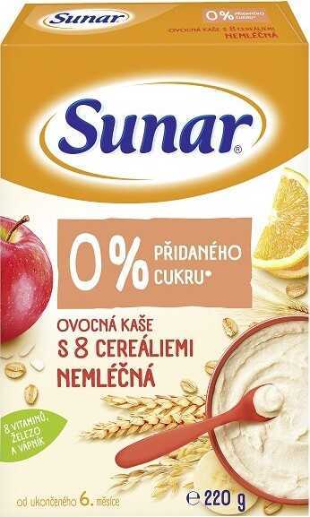Sunar instantní nemléčná ovocná kaše s 8 cereáliemi je ideální při zavádění cereálií a lepku do jídelníčku dítěte. Navíc obsahuje 0 % přidaného cukru. Obsahuje vysoký obsah vlákniny, 8 vitamínů, železo a vápník. Ideální pro děti s rizikem vzniku alergie na bílkovinu kravského mléka Od ukončeného 6. měsíce věku. Balení obsahuje 220 g.