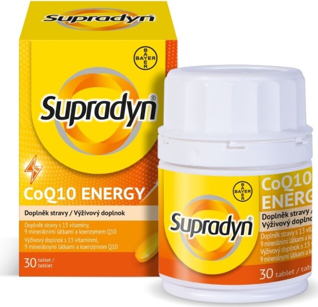 Chybí vám energie? Potřebujete dobít baterky? Supradyn CoQ10 energy obsahuje niacin, který přispívá ke snížení míry únavy a vyčerpání nejen v náročných obdobích.Supradyn CoQ10 energy je multivitaminový doplněk stravy, který obsahuje vitaminy, minerály a stopové prvky se speciálně dávkovaným komplexem vitaminů skupiny B, vitaminu C, hořčíku a vápníku. Kromě vitaminů a minerálů obsahuje také koenzym Q10. Koenzym Q10 je obsažen v každé buňce lidského těla a podporuje přeměnu a využití energie.Výhody výrobkuVyvážený komplex vitaminů, minerálů a stopových prvků s koenzymem Q10Vápník a železo přispívají k normálnímu energetickému metabolismuVitamin B12 pomáhá snižovat míru únavy a vyčerpáníPro energii v náročném obdobíVitamin C a D podporují normální fungování imunitního systémuDostupné ve formě potahových / šumivých tablet s pomerančovou příchutíSpecifika produktuSupradyn CoQ10 energy obsahuje vhodně dávkovaný komplex vitaminů, např. B2, B6 a B12, vitamin C a hořčík, které přispívají k normální funkci energetického metabolismu.Supradyn CoQ10 energy obsahuje také koenzym Q10, mezi jehož nejdůležitější funkce v těle patří tvorba buněčné energie.Balení obsahuje 30 tablet.