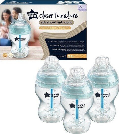 Tommee Tippee Kojenecká lahev Pomalý průtok 260ml 0m+ je kojenecká láhev CTN ANTI-COLIC Tommee Tippee s nejúčinnějším řešením pro miminka se sklonem k břišním kolikám.Kojenecká láhev Tommee Tippee ANTI-COLIC Advanced nabízí nejúčinnější řešení pro miminka se sklonem k břišním kolikám. Patentovaný antikolikový ventil zajišťuje dokonalý odvod vzduchu během krmení a umožňuje dítěti zcela plynulé sání bez polykání vzduchu. Unikátní silikonová savička věrně napodobuje mateřský prs při kojení a tím umožňuje maminkám snadné a bezpečné kombinování kojení a krmení z lahve. Funkce kontroly teploty mléka uvnitř lahvičky varuje rodiče v případě, že je tekutina teplejší než doporučených 37°C.Pro snadné čištění je součástí lahviček i úzký dlouhý kartáček pro čištění trubičky ventilu. Náhradní silikonové savičky k těmto lahvičkám nesou rovněž označení Advanced Anti-Colic.Vhodné od 0 měsíců.Objem lahvičky je 260 ml.Balení obsahuje 3 ks lahviček.