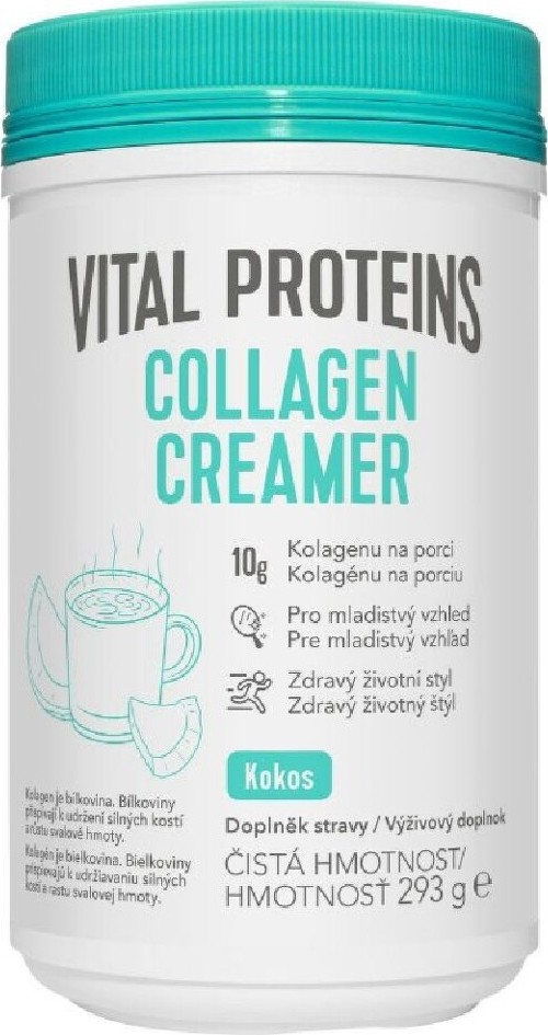 Vital Proteins Collagen Creamer Kokos je doplněk stravy, který přidá do vaší ranní kávy kolagen a zároveň krémovitost. Díky sušenému kokosovému mléku obsahuje zdravé tuky (MCT) a je bez lepku. Obsahuje vysokou denní dávku kolagenových peptidů na porci – 10 g. Kolagen je bílkovina. Bílkoviny přispívají k udržení normálního stavu kostí a růstu svalové hmoty. Neobsahuje sóju, karagenan, lepek, laktózu*, umělá sladidla ani přidané cukry. Je možné ho přidat do kávy, čaje, jogurtu, ovesných kaší a dalších receptů.Snadno se rozmíchá v jakémkoliv teplém nápoji. Většina lidí si ho přidává do kávy, mléka nebo oblíbených receptů.Co podporuje kolagen v lidském těle?Pružnou pleť, lesklé vlasy, pevné nehty, funkční klouby, zářivou pleť, hydrataci pokožky.Čím jsme starší, tím méně kolagenu si naše tělo dokáže samo produkovat. Naše potřeba kolagenu však s časem roste.Poté, co dosáhneme věku 25 let, klesá naše produkce kolagenu o 1 % ročně.*Primárně vyrobeno bez laktózy. Může obsahovat pouze stopy mléka.Balení obsahuje 293 g (cca 12 dávek).