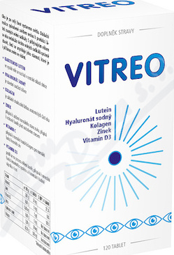 Vitreo je doplněk stravy ve formě tablet, který obsahuje hyaluronát sodný, kolagen, lutein a zinek. Zinek přispívá k udržení normálního stavu zraku. Balení obsahuje 120 tablet.