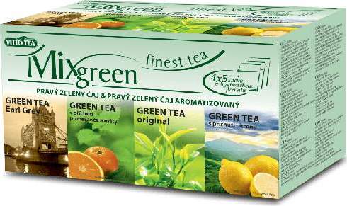VITTO TEA MIXGREEN obsahuje čtyři druhy zeleného čaje s různými příchutěmi. Tři druhy čajůl jsou dochuceny ovocnými příchutěmi: citrónová, bergamotová a pomerančová a čtvrtý čaj je čistě zelený. Balení obsahuje 20 nálevových sáčků o obsahu 2 g.